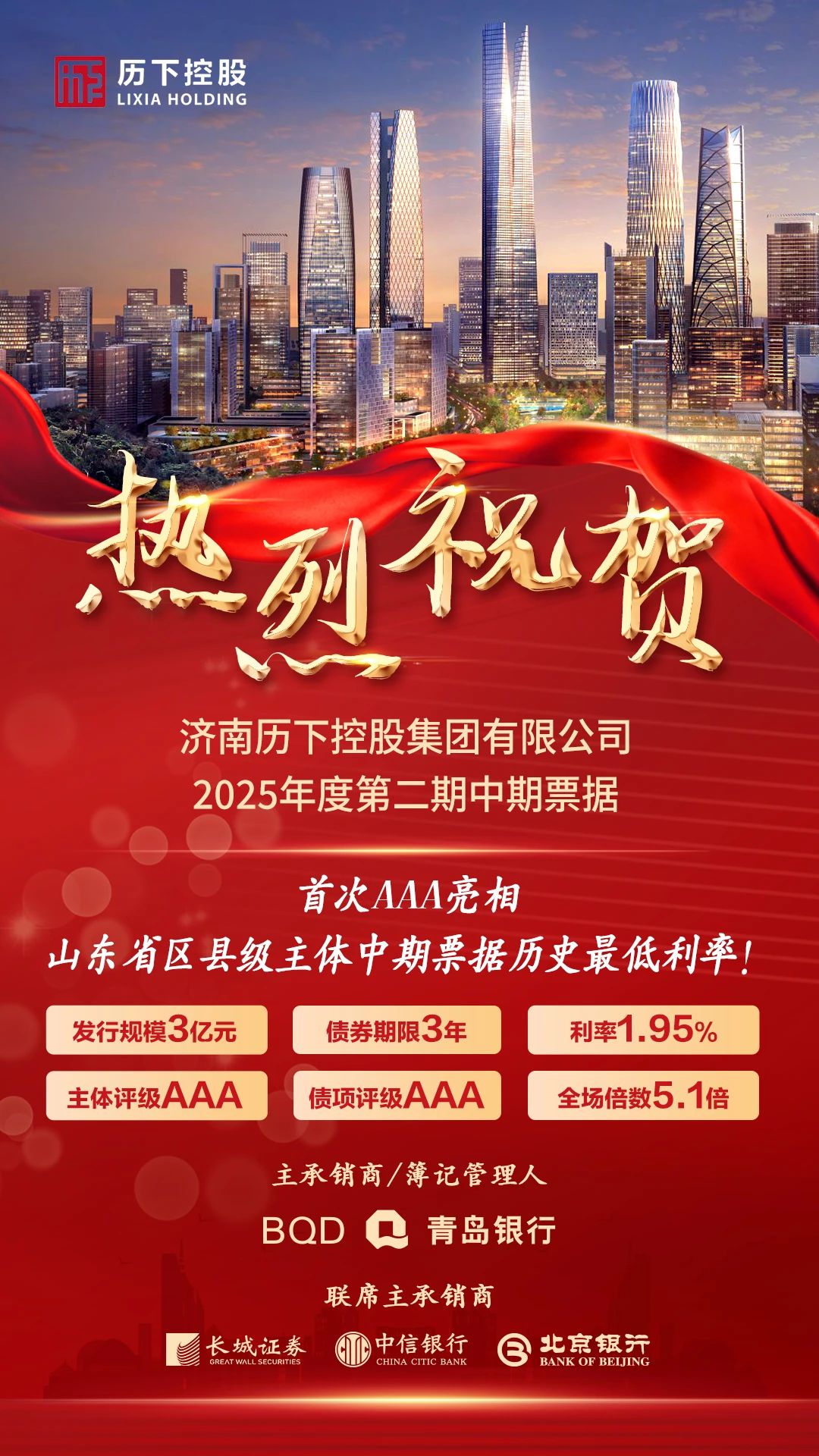 2025年7月24日,济南爱游戏官方网站集团有限公司成功发行2025年第二期中期票据,发行金额3亿元,期限3年,票面利率1 95%,全场认购倍数5 1