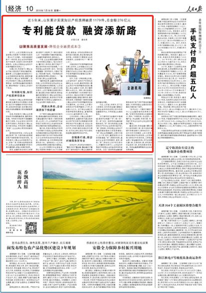 7月16日出版的人民日报,以《专利能贷款 融资添新路》为题,在《聚焦高质量发展·降低企业融资成本》专栏策划中,对山东通过知识产权
